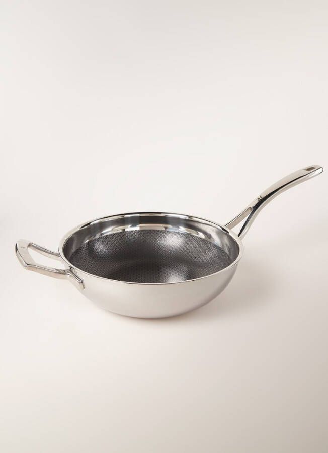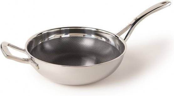 ProfiResist wokpan van WMF. Deze wokpan is vervaardigd uit een combinatie van roestvrij staal en gepolijst chroom. Dit model heeft een diameter van 28 cm en is voorzien van een anti-aanbaklaag. Door de honingraatstructuur is de pan krasbestendig en gemakkelijk schoon te maken. Dankzij de gelaagde opbouw heeft de pan een gelijkmatige en snelle warmtegeleiding. De pan is geschikt voor alle warmtebronnen inclusief inductie. De pannen uit de ProfiResist serie van WMF bieden de voordelen van een roetvrijstalen pan in combinatie met een anti-aanbaklaag. De pannen bestaan uit drie lagen: ze hebben een kern van aluminium, roestvrijstalen binnenkant en een buitenkant van chroom. De pannen zijn voorzien van een anti-aanbaklaag met een honingraatstructuur waardoor gerechten niet aan de pan kleven. Op deze manier kun je gerechten snel en heet bereiden.
